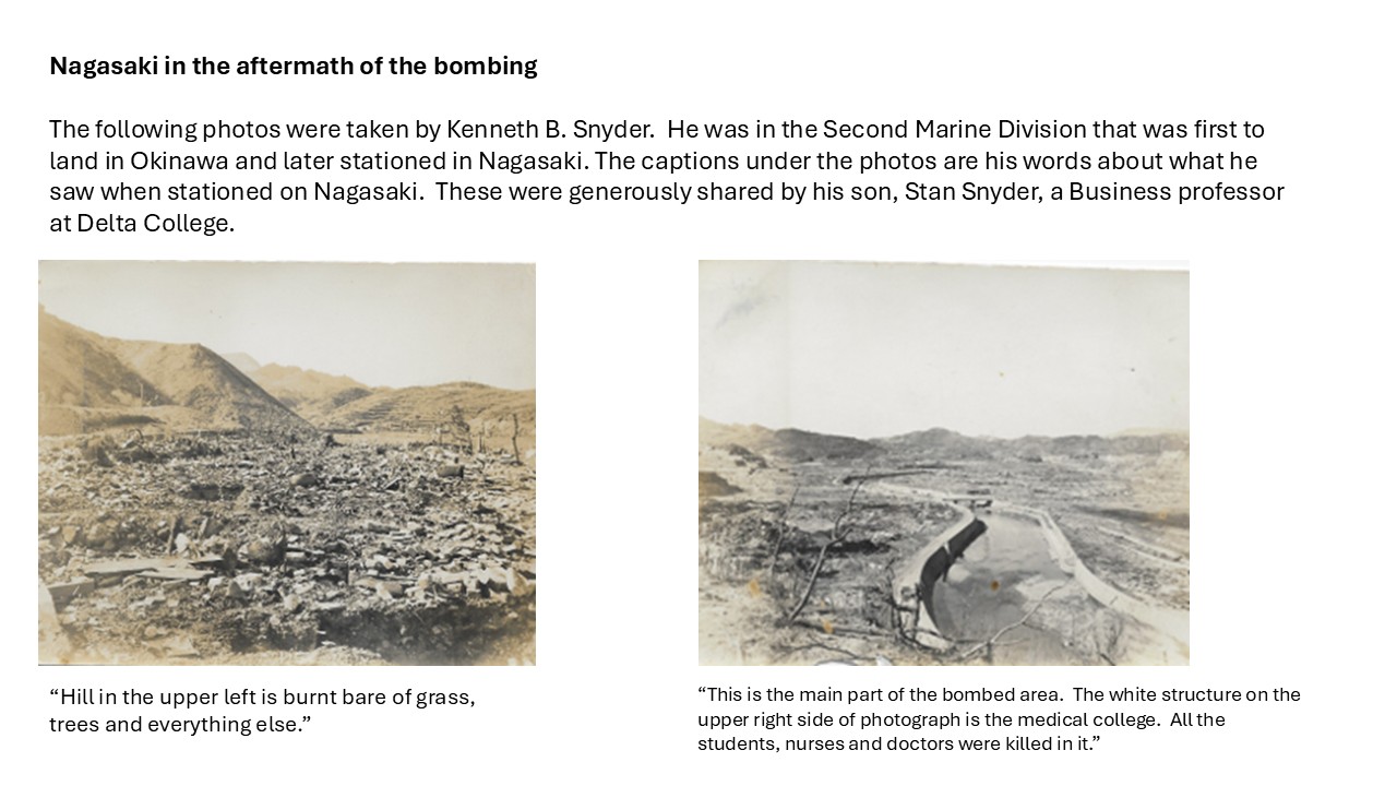HLC Miscellany, UncategorizedHiroshima / Nagasaki online picture exhibition In conjunction with the HLC’s Brown Bag event on the bombing of Hiroshima and Nagasaki, we present a small online exhibition of pictures provided by Delta College faculty members. Share this: Click to share on X (Opens in new window) X Click to share on Facebook (Opens in new window) Facebook Click to email a link to a friend (Opens in new window) Email Like Loading...